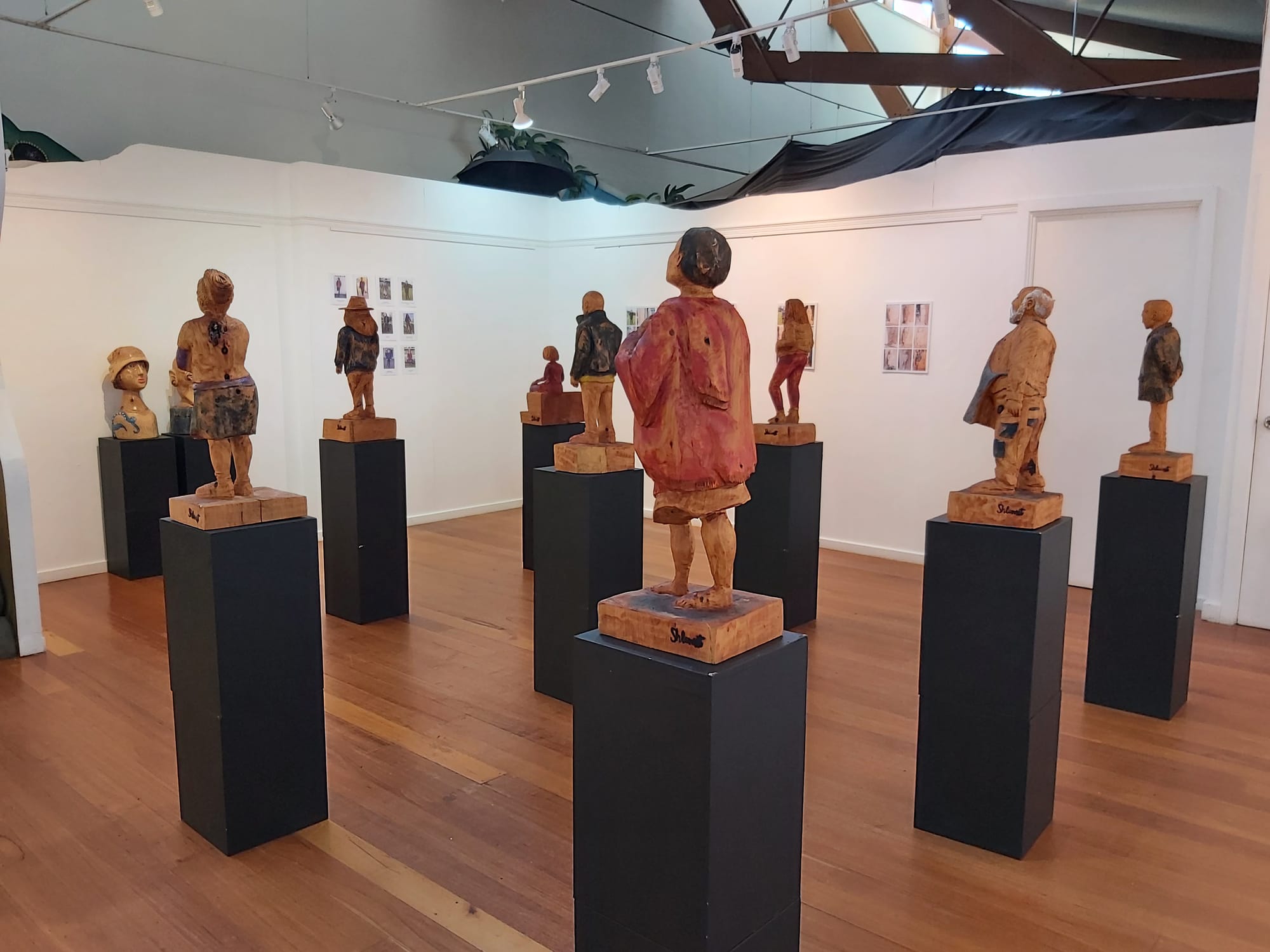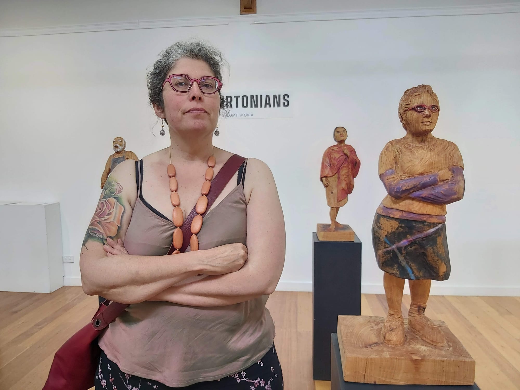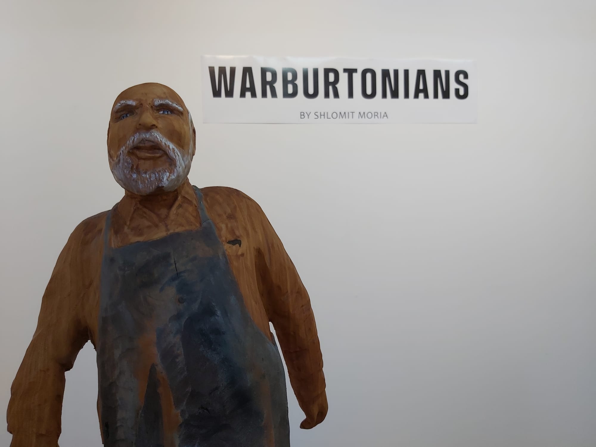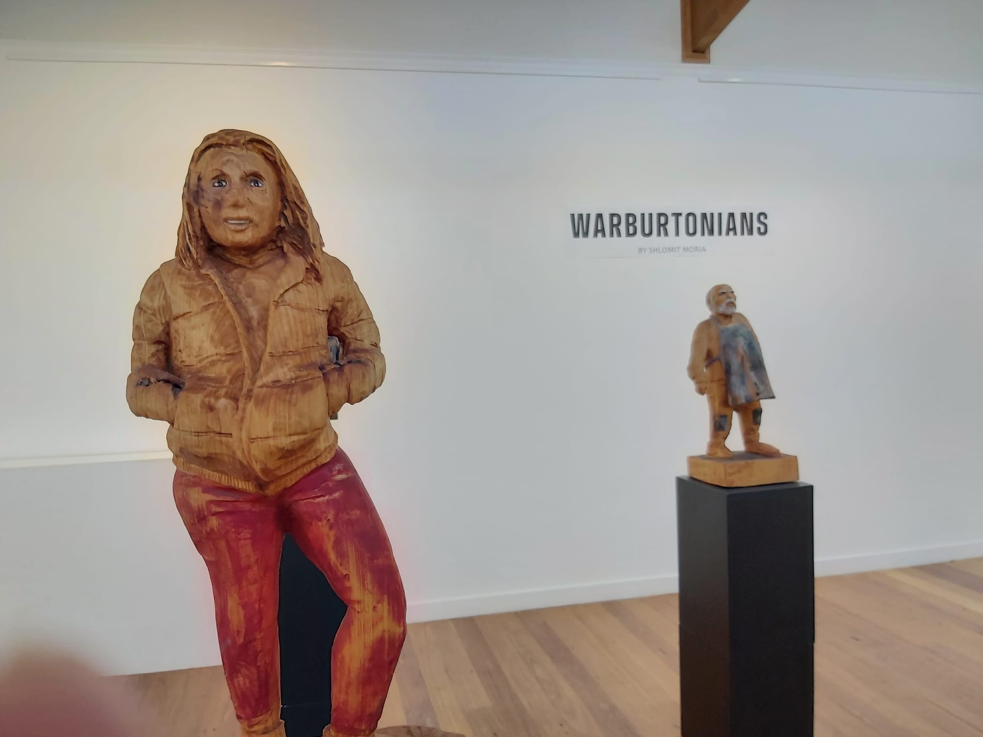 Shlomit shares her deep respect for community and connection in “Warburtonians”, a collection of ten sculptures in the human form, and the characteristics that make us who we are. Carved with a chainsaw and hand tools from reclaimed local cypress, these three dimensional sculptures represent a gathering of local people central to Shlomit’s life during the multiple lockdowns experienced by her community during the pandemic. Each figure, in her first solo exhibition, is a study in perspective, leading Shlomit into detailed explorations of anatomy and physiology and the unique relationships between the elements of the body that imbibe each person with their character. Influenced by her per-pandemic tour in India, where Shlomit spent a month practicing the art of traditional Tibetan wood carving, these sculptures also reflect a process of quiet observation and a commitment to slowing down her practice and observing and refining each detail to its ultimate execution. To rush was to empty the process of its finest destination, and as we observe each of the ten sculptures we are taken deeply into the nuance of personality, and the minutia that makes us human. Shlomit’s work is an invitation for us consider the beauty of the whole as a sum of its parts, and to share in the sense of companionship present in each figure. This work was an antidote to the isolation and creative vacuum felt during the pandemic and reminds us of the humanity that has held us steady and ‘solid’ during such times. She is delighted to continue work on this project with the intention of developing a village of local people as part of her life’s work.