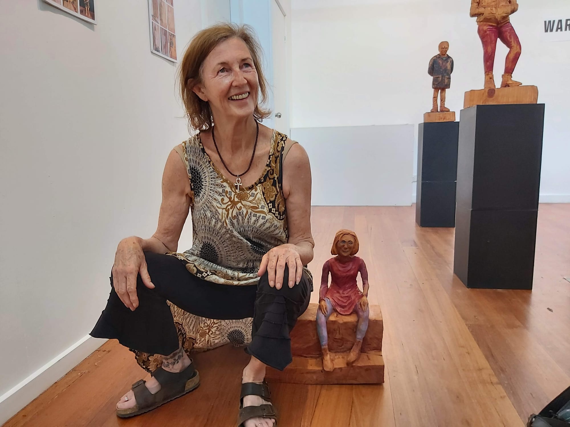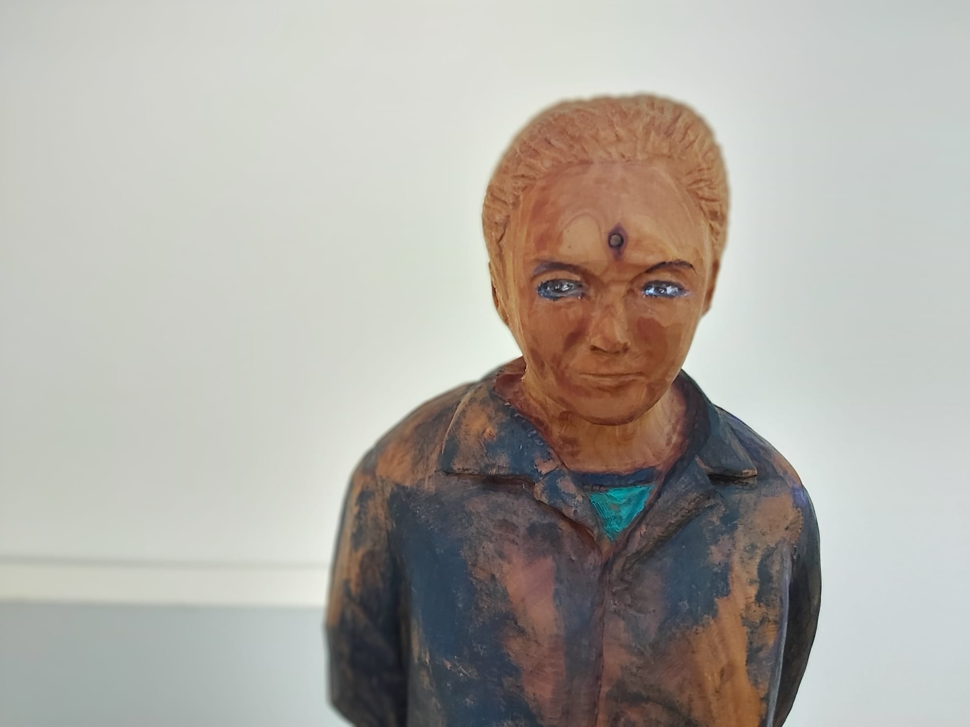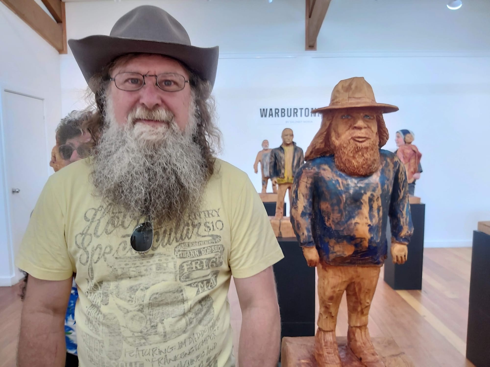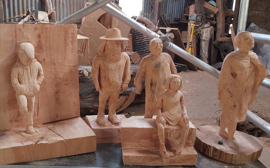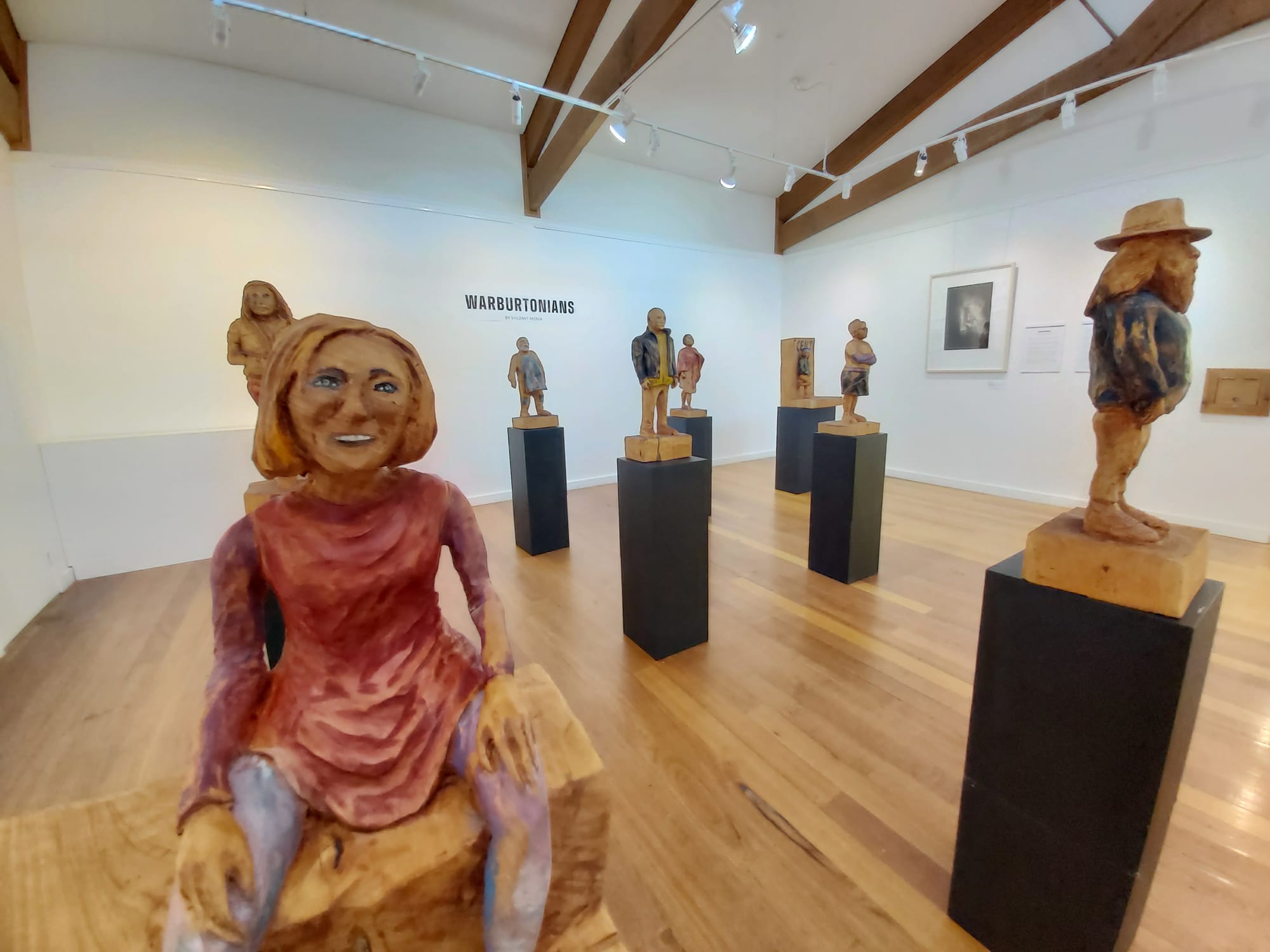 Shlomit shares her deep respect for community and connection in “Warburtonians”, a collection of ten sculptures in the human form, and the characteristics that make us who we are. Carved with a chainsaw and hand tools from reclaimed local cypress, these three dimensional sculptures represent a gathering of local people central to Shlomit’s life during the multiple lockdowns experienced by her community during the pandemic. Each figure, in her first solo exhibition, is a study in perspective, leading Shlomit into detailed explorations of anatomy and physiology and the unique relationships between the elements of the body that imbibe each person with their character. Influenced by her per-pandemic tour in India, where Shlomit spent a month practicing the art of traditional Tibetan wood carving, these sculptures also reflect a process of quiet observation and a commitment to slowing down her practice and observing and refining each detail to its ultimate execution. To rush was to empty the process of its finest destination, and as we observe each of the ten sculptures we are taken deeply into the nuance of personality, and the minutia that makes us human. Shlomit’s work is an invitation for us consider the beauty of the whole as a sum of its parts, and to share in the sense of companionship present in each figure. This work was an antidote to the isolation and creative vacuum felt during the pandemic and reminds us of the humanity that has held us steady and ‘solid’ during such times. She is delighted to continue work on this project with the intention of developing a village of local people as part of her life’s work.