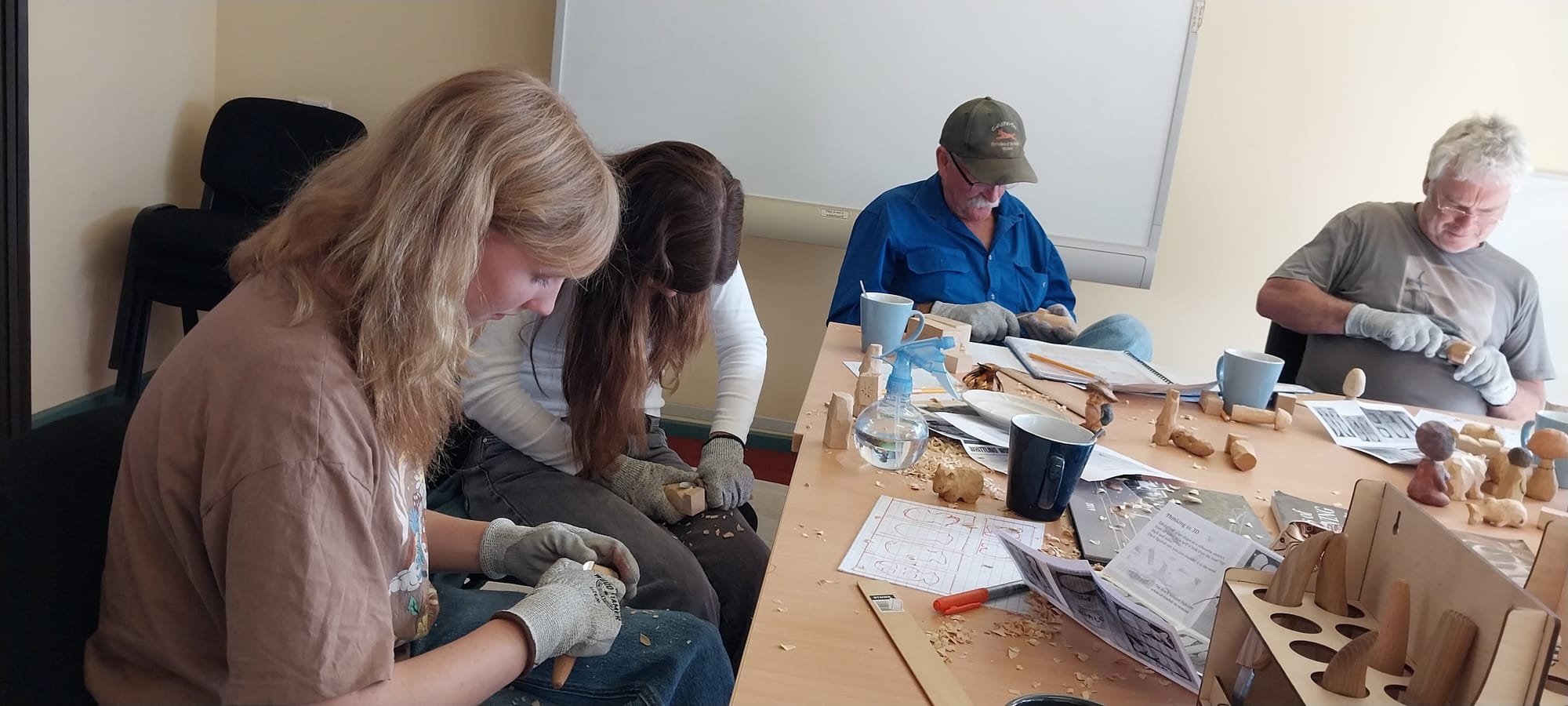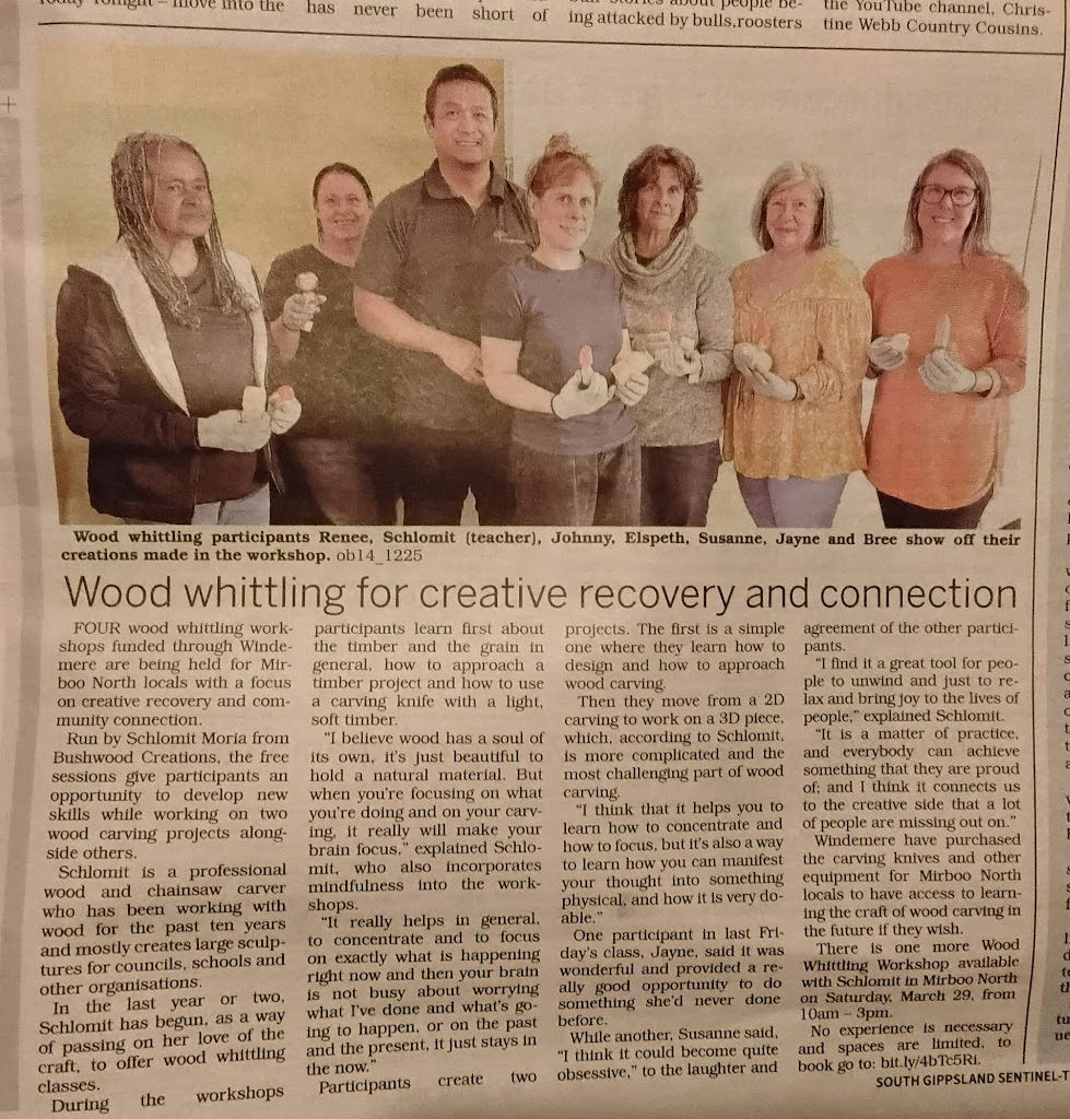 In 2024, after a devastating storm struck the rural community of Mirboo North, I was invited by Windermere - a recovery support organisation - to contribute to the recovery process by running carving workshops that helped residents reconnect and heal through creativity. The feedback was that such workshops usually attract mostly women, but this time the project brought together people from all walks of life - men, young people, grandparents, farmers, and more. Over several weekends, I got to know the people of Mirboo North and loved every moment of it. When the project concluded, the community received a set of whittling knives, cut-resistant gloves, and timber, all of which are now kept at the local library for any group to use and continue enjoying whittling together.